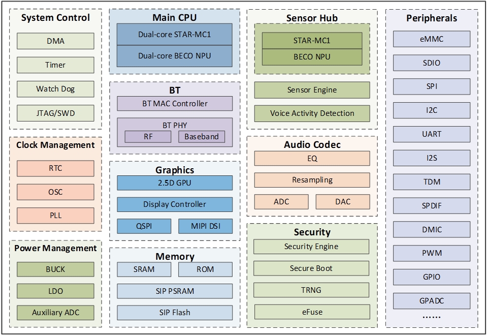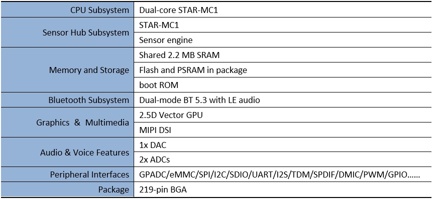 The platform incorporates a dual-mode Bluetooth 5.3 subsystem, a codec subsystem and a graphics subsystem that includes a 2.5D GPU for advanced graphics features, an LCD controller with up to 3-layer alpha blending, and a 1-lane DSI with up to 500x500x24bit 60fps resolution. System Block Diagram